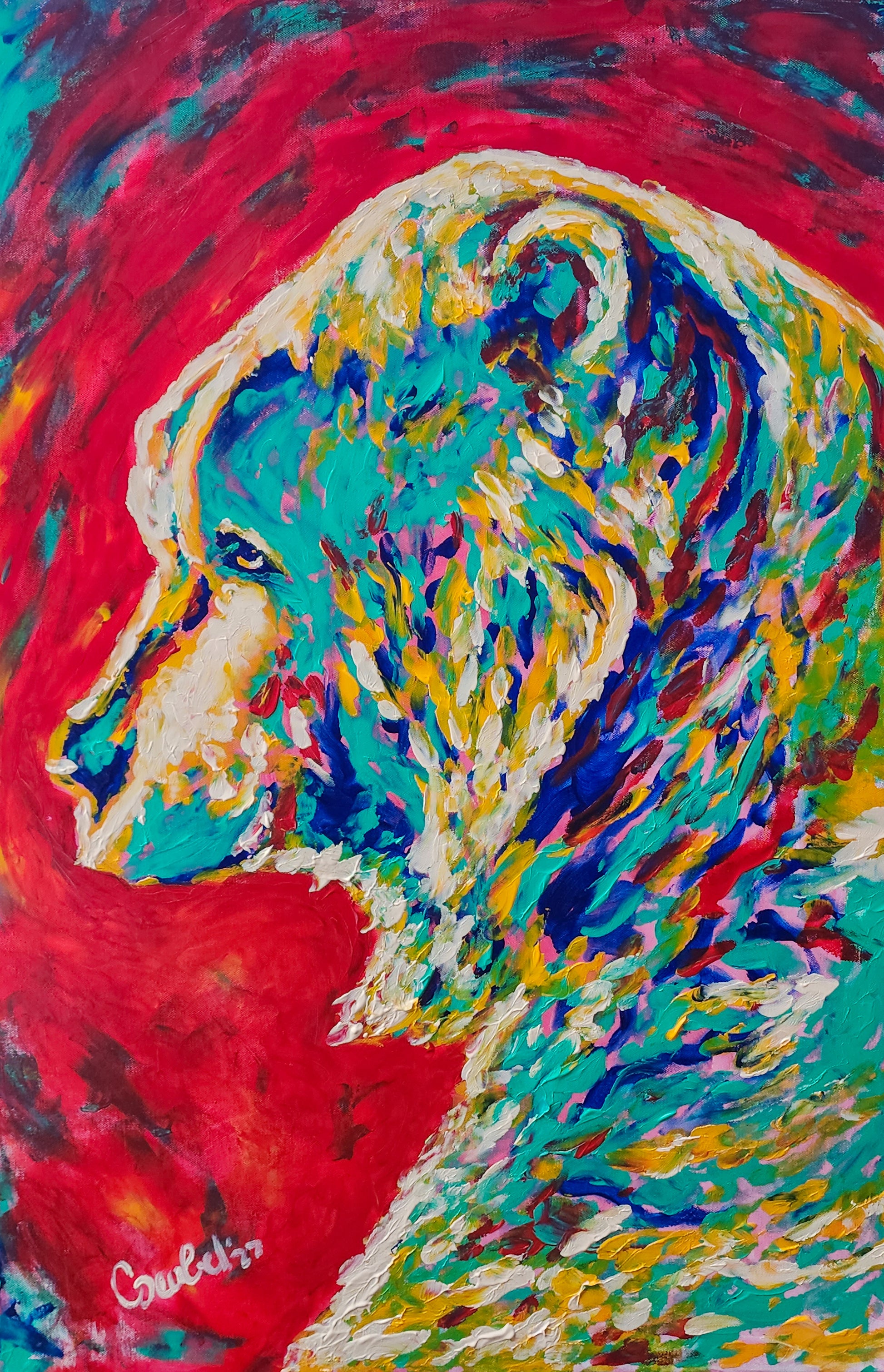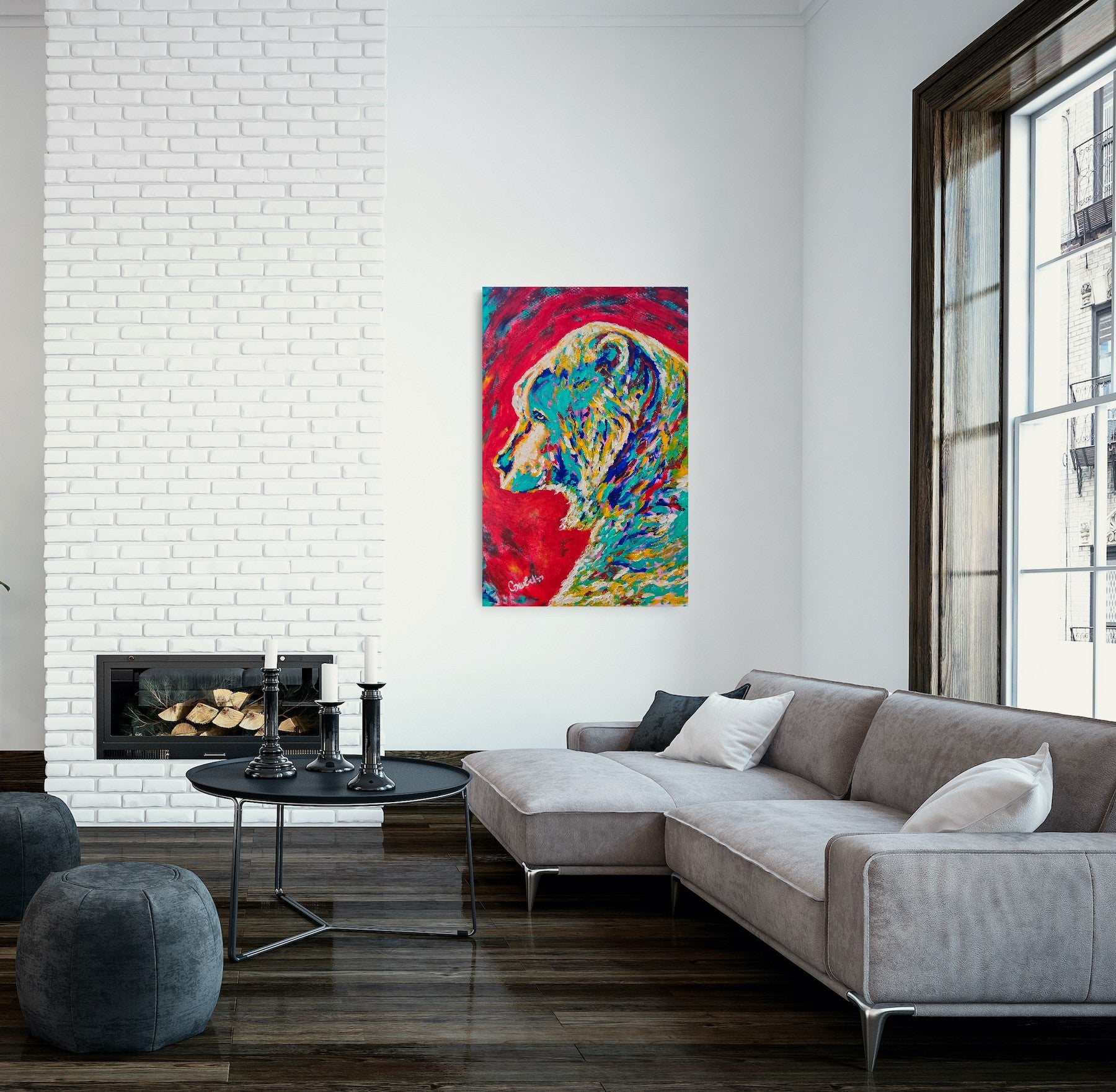 A whimsical fusion of reds and turquoise, 'Sheepish Bear' comes to life. Finger-painted with playful strokes, this piece captures the bashful charm of a bear trying to hide its sheepish grin. Perfect for adding a pop of color and whimsy to any room, this artwork will bring a smile to your face and a twinkle to your eye.